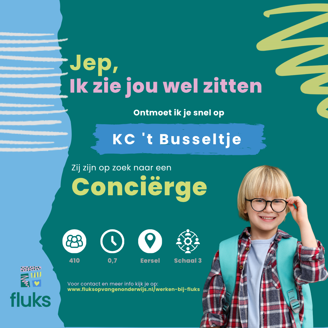 Kindcentrum ‘t Busseltje maakt deel uit van Fluks, een organisatie voor opvang en onderwijs voor kinderen van 0 tot 13 jaar in de Kempen en Midden-Limburg. Met onze kindcentra in 16 plaatsen binnen 11 gemeenten bieden we dagelijks een plek waar kinderen kunnen ontdekken, groeien en zich voorbereiden op de toekomst.
